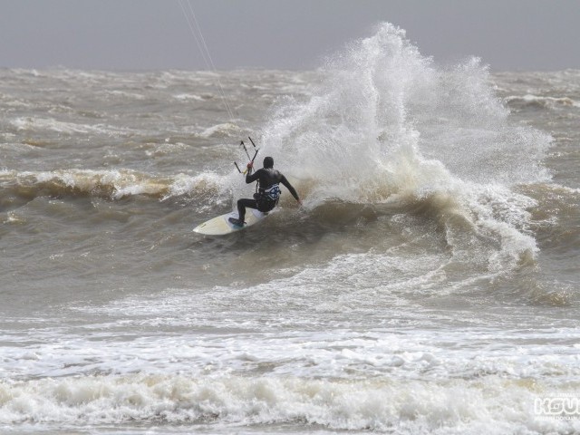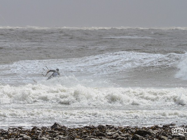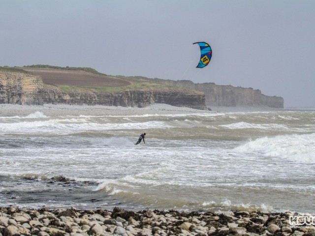 My buddy Neil, who had posted that fateful comment on my Facebook wall less than 15 hours earlier, assured me it would get better as the tide dropped a little more. So we braved the freezing cold, pulled on some neoprene and pumped up our smallest kites. Clambering down and over the rocks to the launch site I considered that this was possibly the windiest I had ever been out with a kite – I could barely walk into the wind to the launch site.